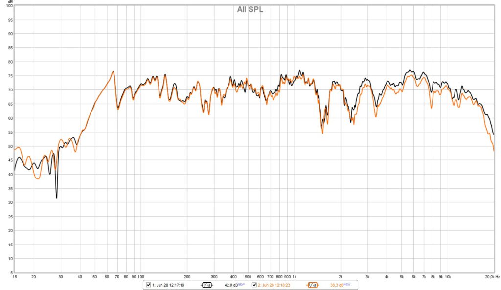 Auf der Messung zu sehen: die schwarze Messkurve > ohne Stoff und die orange Kurve mit Stoff vor dem Lautsprecher.