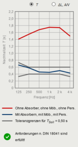 Bei einem Konzertsaal oder Theater wird typischerweise eine Nachhallzeit von 0.9-1.2 Sekunden angestrebt. Jedoch sind hier nicht nur der reine "Nachhall" zu bewerten sondern auch die Klarheit und Brillanz des Klanges, der sich durch die Diffusität der Wände und Decken sowie der Schalllenkung ergeben.