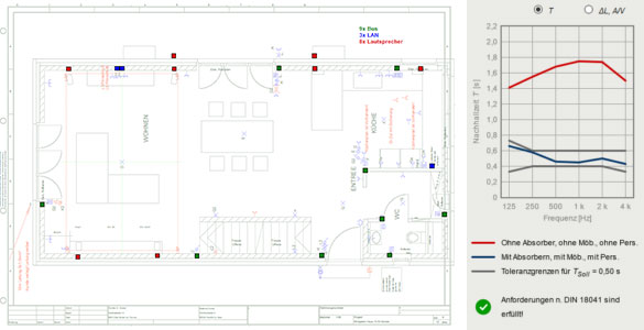 Wie oben erwähnt, gibt es für Wohnräume keine explizite DIN, jedoch ziehe ich hier bei meiner Beratung die DIN 18041 heran. Mit einem Mix von verschiedensten Vorsatzschalen-Konstruktion und Materialien lassen sich auch in Bezug auf Architektur Ästhetik hochwirksame Raumakustik-Verbesserungen erzielen.