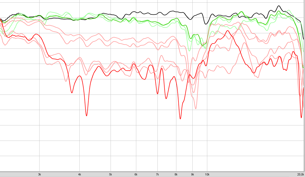 Auf der Messung zu sehen: die schwarze Messkurve > ohne Stoff und die orange Kurve mit Stoff vor dem Lautsprecher.